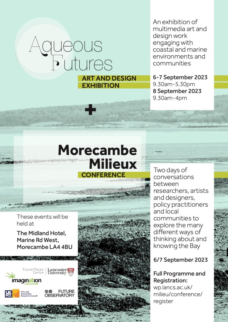 “The three-day event: Morecambe Milieux, Aqueous Futures at the historic art-deco Midland Hotel will gather together a diversity of voices, practices and perspectives from arts, sciences, local governance and communities— from university and other knowledge settings — in the muddy, soaked, interstitial environment of Morecambe Bay itself. The event is presented by Future Places Centre Lancaster University to share stories from the Bay, and its upstream settings along-side other inter-tidal, wetland and coastal contexts from around the world. Conversations will critically engage with the relationship between place based environmental knowledge and action in the face of climate vulnerability while opening up a variety of ways for thinking about and experiencing wetlands and watery environments.”