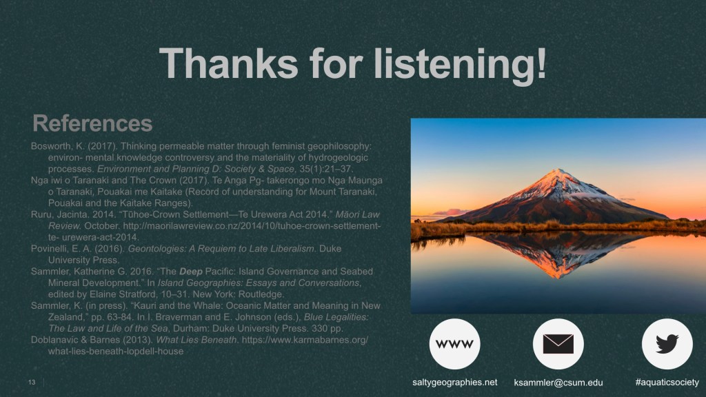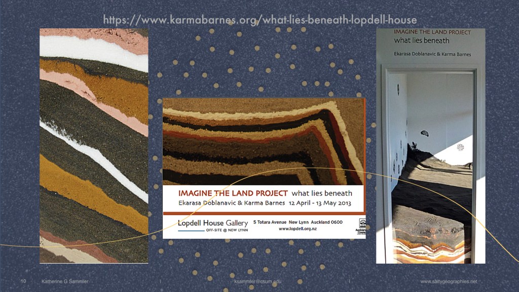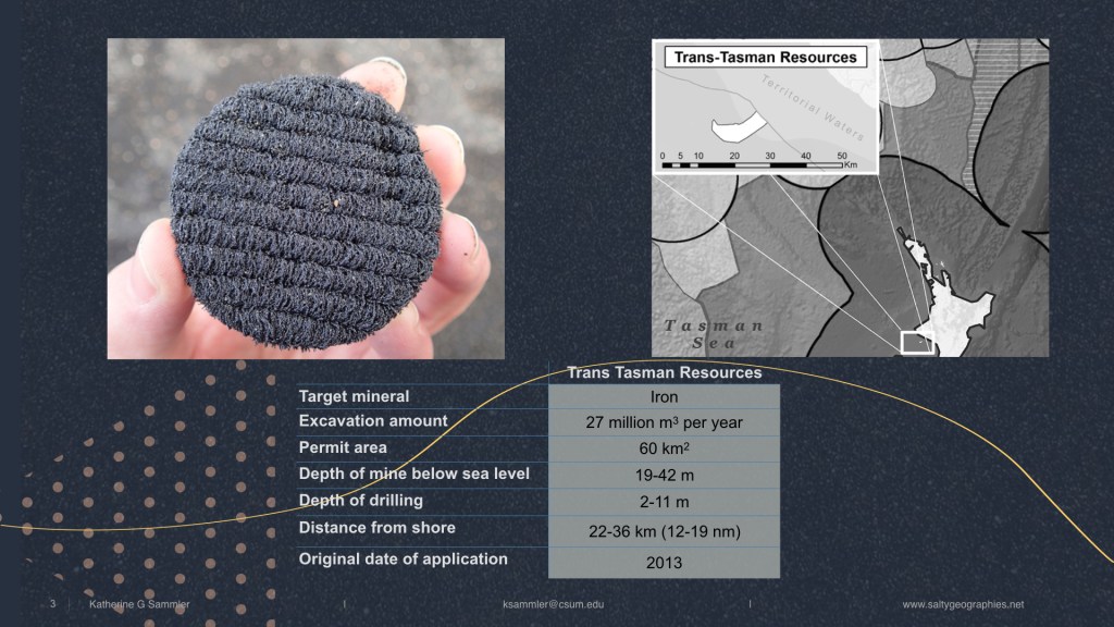 ABSTRACT: The black sands off Aotearoa New Zealand’s Taranaki Bight are made of titanomagnetite, containing high concentrations of iron. Their dark color and magnetic properties signify the coveted ore within, targeted for controversial seabed mining. These sands originate from the volcanic Mt. Taranaki, eroded by streams and rivers into the ocean, representing a direct material exchange from mountains to sea. Mt. Taranaki is the third geographic feature in the country to receive legal personality, meaning local Māori tribes will share guardianship of the sacred mountain with the government, as opposed to exerting human sovereignty over it. Within the context of longstanding disputes over Māori rights to the foreshore, the fractal property of coasts draw attention to the material politics of dividing land and sea, and therefore offshore resource rights. This sand exhibits geontological tensions between the entangled natures of life/non-life, subject/object, interior/exterior, and the mobility and spatiality of a granular body.