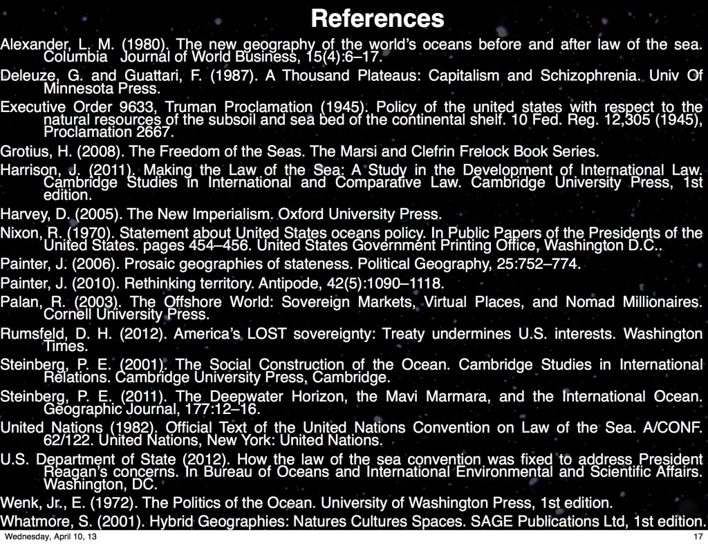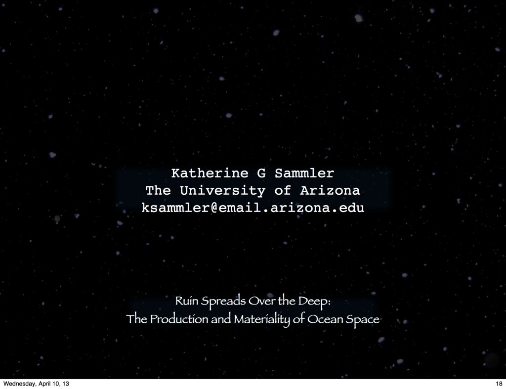 2013 Sammler, K. Ruin Spreads Over the Deep: The Production and Materiality of Ocean Space. Association of American Geographers, Los Angeles, CA 9–13 Apr.